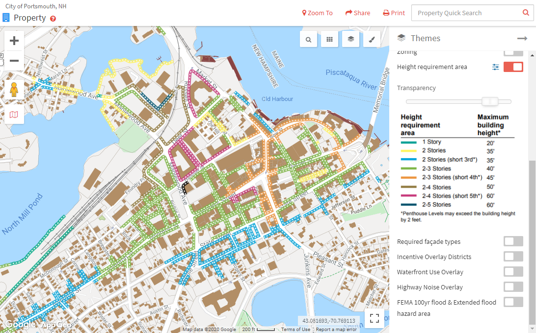 Going beyond just displaying zoning data Portsmouth NH has information about maximum building heights for different height requirement areas and required facade types. If data like this or some variation of it is important for your town of city then we can help you develop the data and display it on MapGeo.