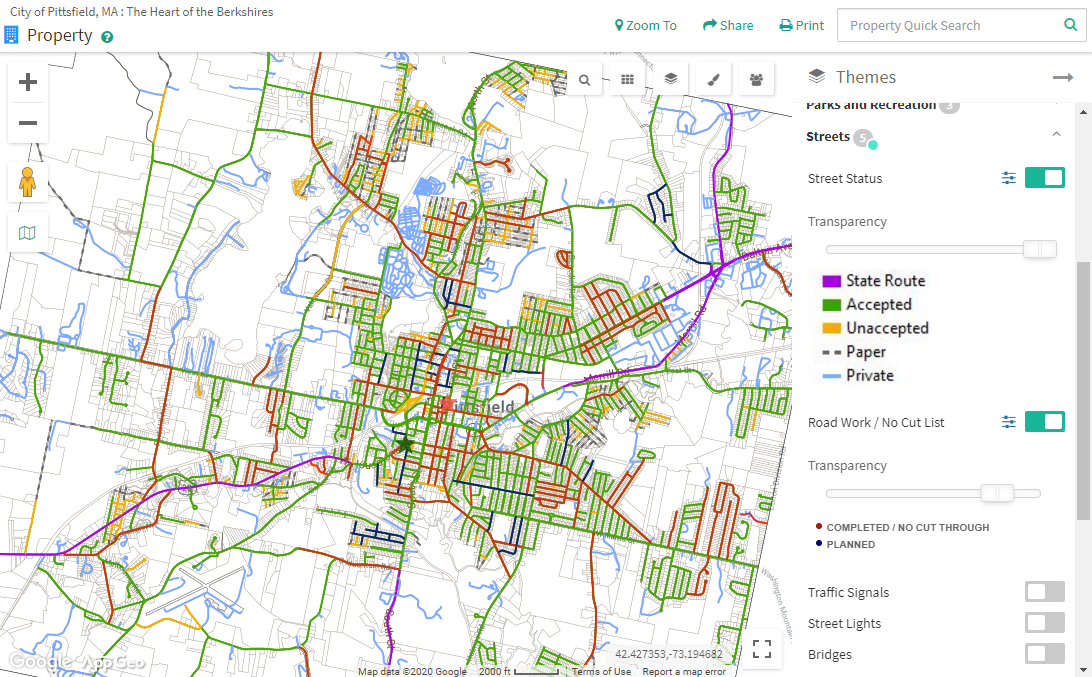 The City of Pittsfield MA displays road work projects on their MapGeo site. It is a great resource for citizens to find out about road work projects that may affect their neighborhood and the status of those projects. They also have information about street status - another critical piece of information for New England towns and cities.