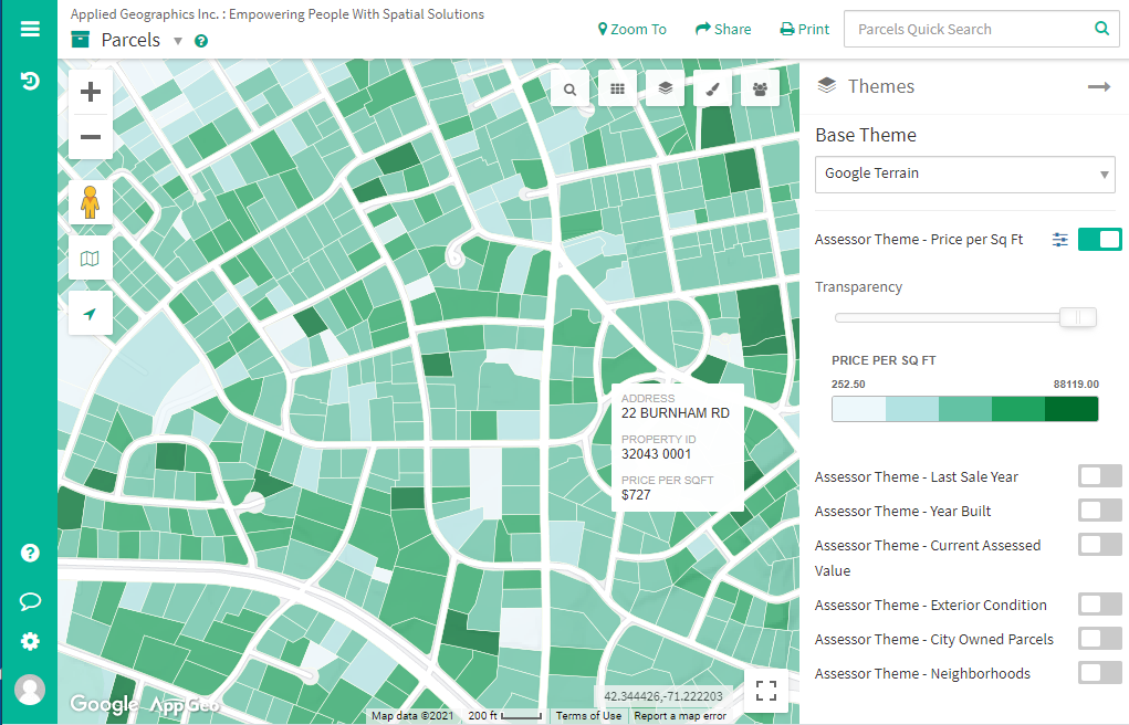 We have also developed several new Map Themes that visualize assessor data on the map. Choose from specially priced packages of themes that visually display data to easily identify patterns and trends, comparable parcels and more. Contact mapgeosupport@mapgeo.io or your project manager to learn more. Examples include: