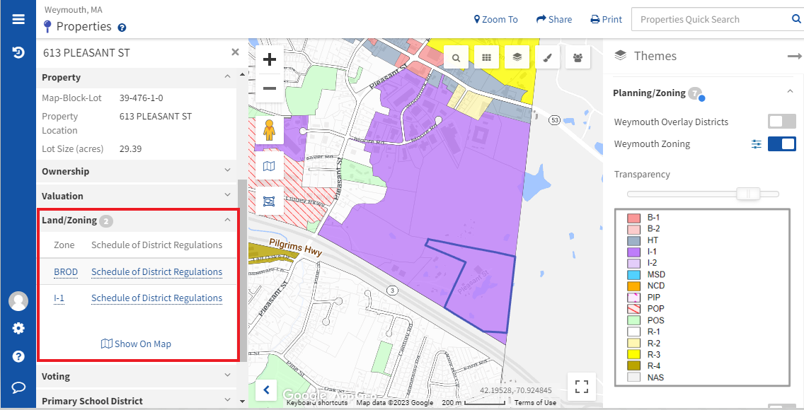 Weymouth’s Land/Zoning Regulations and Zoning Permitted Uses website are linked within the property panel of MapGeo for quick access.