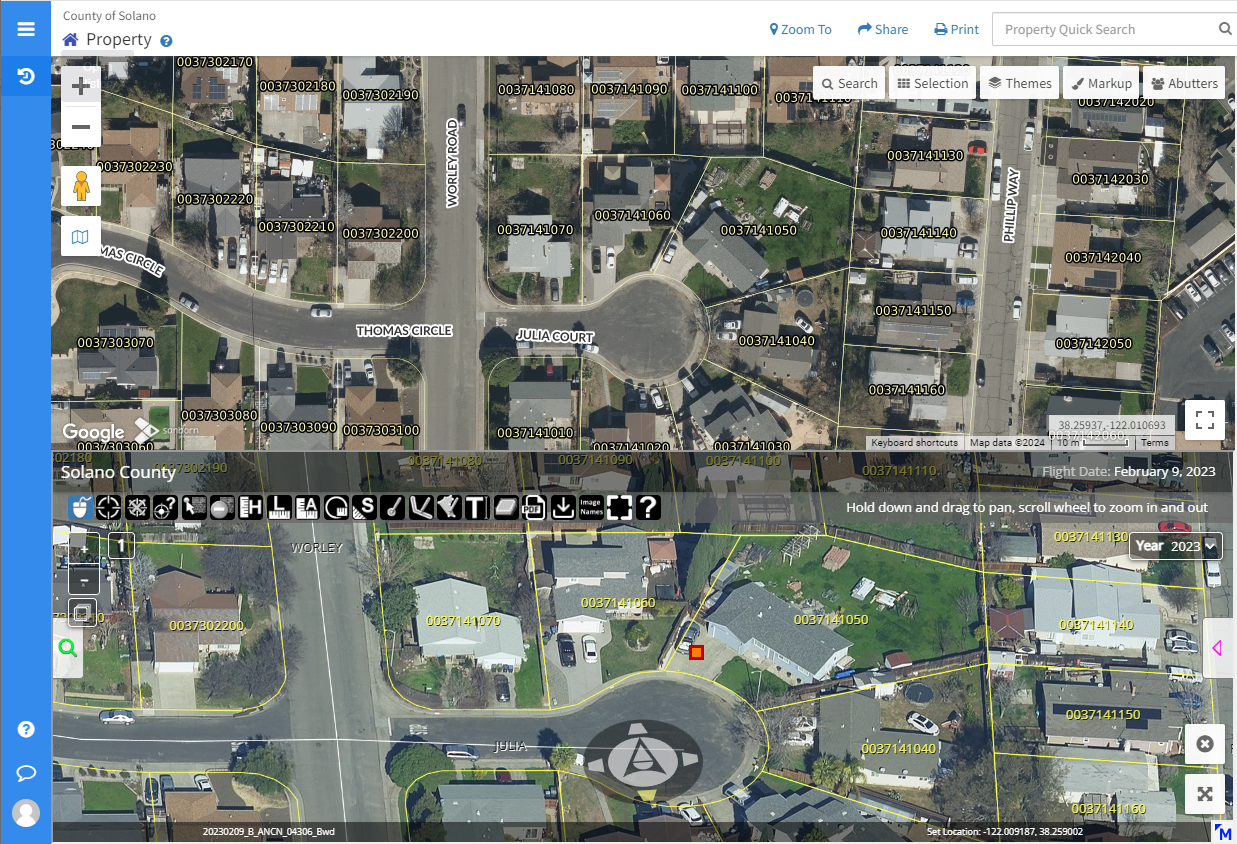 Our newest MapGeo enhancement is the Integration of the Sanborn Oblique Analyst® (SOA). The SOA is a web-based viewer that provides maximum usability for your oblique imagery. Oblique imagery delivered by Sanborn are in non-proprietary, Cloud Optimized GeoTIFF format, without restrictions on who you allow to use the data. The SOA is licensed in perpetuity, with unlimited user access, no ongoing cost, flexible hosting options (Sanborn-hosted, Self-hosting, Cloud, etc.), and with optional support and maintenance subscriptions. The below image demonstrates the integration of the SOA (bottom of split screen) within MapGeo. Please contact us for more information or a demo!