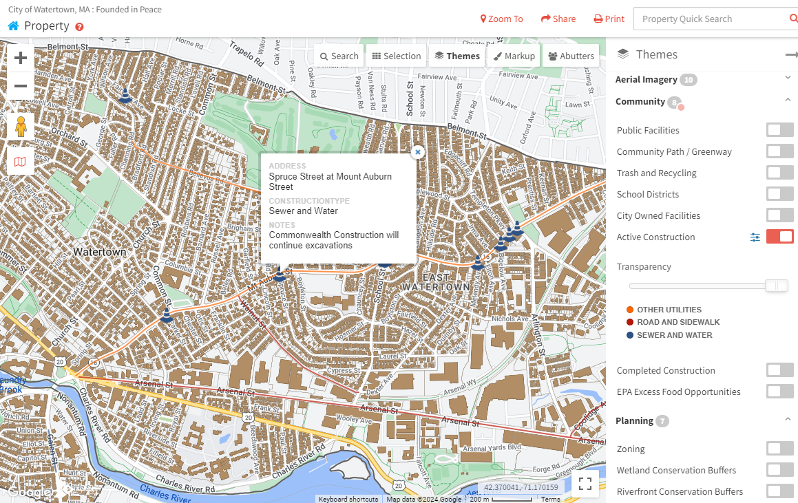 Over the past year, the City of Watertown has been working with the AppGeo Division to provide the citizens of Watertown with an up-to-date overview of all the active construction work in the City. This publicly available MapGeo theme allows residents to get a visual representation of construction work in their area which also includes important information such as date of construction, type of construction, and extent of construction. In addition to informing the public on the active construction throughout the City, this effort has included building a comprehensive geospatial record of historic construction projects. This GIS data can be leveraged by City staff to identify areas of high construction, areas that have been underserved, and a searchable database of previous construction jobs, that previously would only be available in unconnected PDF documents. This data is empowering City staff to make informed decisions and better tell the story of the construction work being done in the City of Watertown, MA.