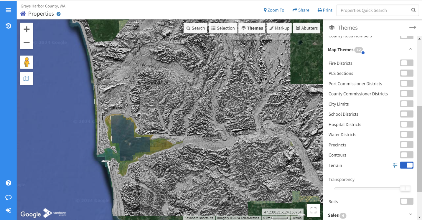 Recently, Grays Harbor County harnessed the power of MapGeo to share their parcel data online for residents and other stakeholders. Grays Harbor’s MapGeo site has over 40 themes available for users to explore. Themes showing Federal State Tribal lands, zoning for metropolitan areas, wetlands and other waterbodies, and even property sales for the past 4 years. Their site also includes a Terrain theme which highlights the mountains, valleys, and riverbeds that make up the county. Check out their MapGeo site to explore these themes and the area!