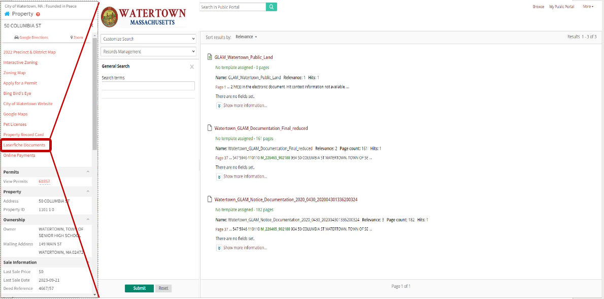 Watertown’s MapGeo integration with Laserfiche as a link in their property panel