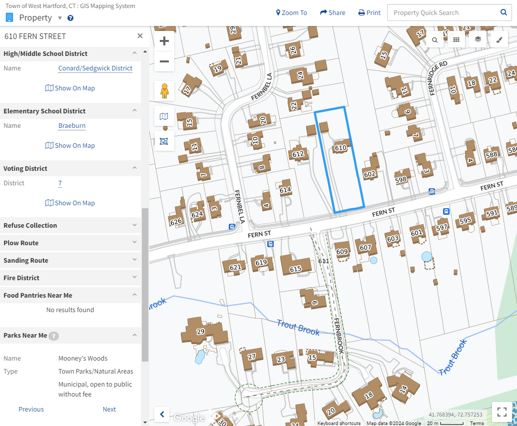 The Town of West Hartford has taken advantage of MapGeo's built-in analytics to display information from spatial data directly within the property panel. This eliminates the need to turn on multiple map themes. MapGeo can analyze data behind the scenes to populate information from a layer, such as school districts, and match it to the selected parcel. In the screenshot below, you can see which school districts this parcel is located in, which sanding route it is along, which voting district it is located in, and what parks/recreation areas are near it.