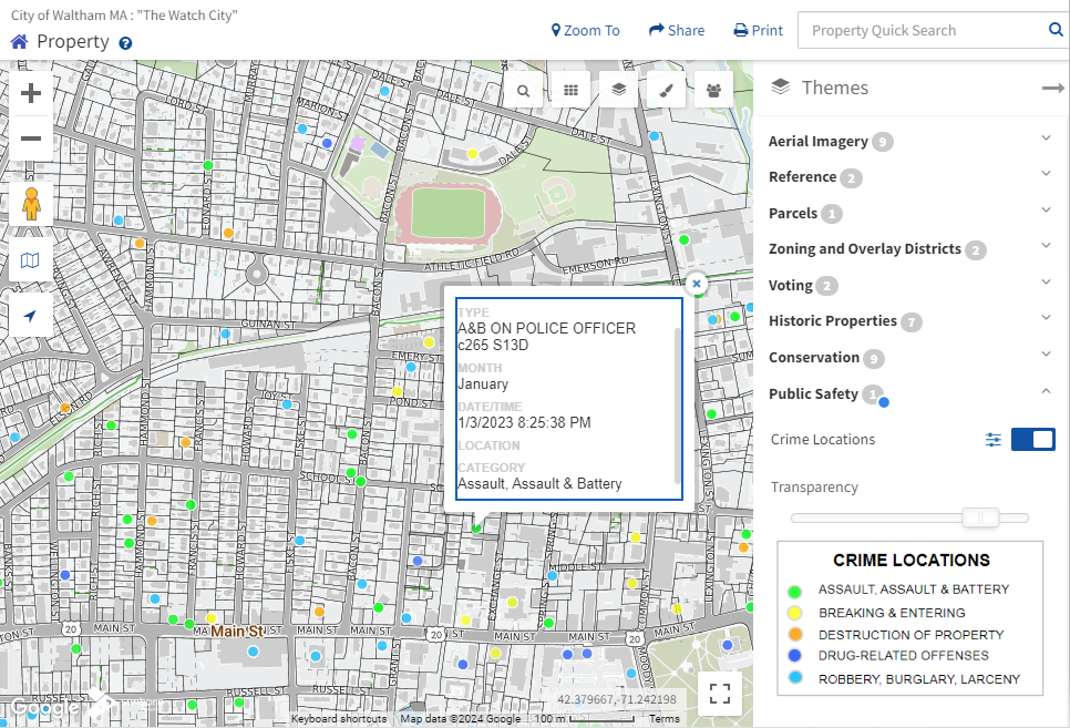 Waltham configured a custom theme on their MapGeo site showing Crime Locations symbolized by the category of crime. A pop-up with details about the crime location was also configured to provide additional information such as date/time, the type of incident, and the location. This theme is publicly available on their site: https://walthamma.mapgeo.io.