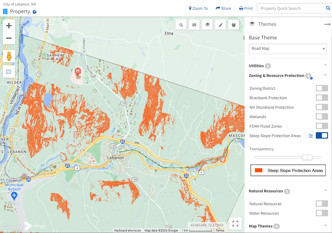 The City of Lebanon, NH recently added a new Steep Slope Protection Areas theme to their MapGeo. Steep slopes are regulated within the city, essentially informing where one can locate a structure, build a driveway, etc., as well as what erosion control measures are required. Although steep slopes occur throughout the city, the regulations only apply within the Rural Lands zoning district.
